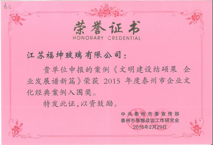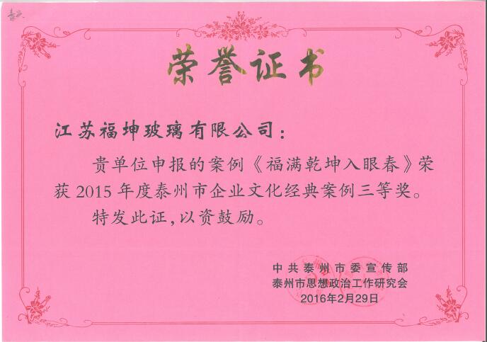 據悉,企業文化經典案例評選活動是由中 共泰州市委宣傳部和泰州市思想政 治工作研究會組織的,為把培育和踐行社會 主義核心價值觀與企業文化相結合,進一步推動核心價值觀建設工作而進行的。 我司案例的獲獎,對進一步推動我司做好企業文化建設工作,讓文化增強凝聚力、激 活生產力,加速企業持續健康發展方面必將發揮更加積極的作用。
