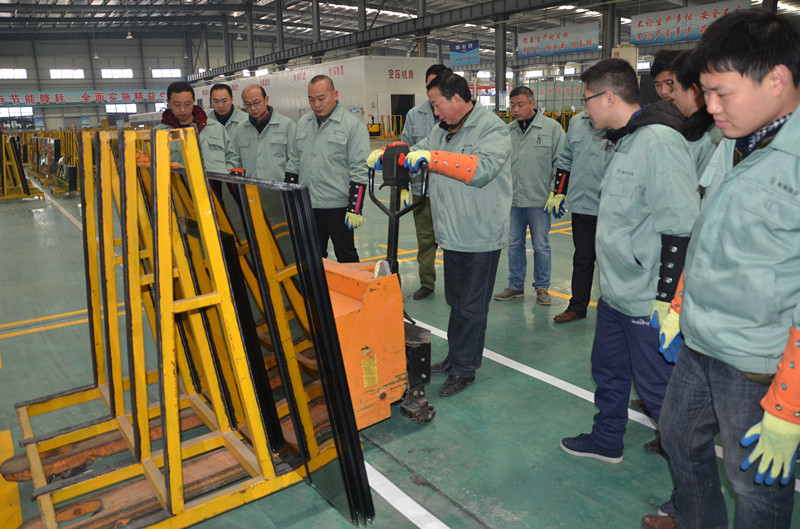 正所謂“讀萬卷書行萬里路”,一名合格的福坤員工除了學習理論外,更需要身體力行。玻璃行業和其他傳統制造業不同,如果不經過崗前充分的安 全教育及業務技能培訓,而是急于讓新員工直接進入生產現場,可能會造成適得其反的作用。為此公司研究決定將生產一線的新員工安排成兩個班組,由他們自己民主選舉班組長,并安排質檢部葉祝健部長、中空班組袁曉紅主任兩人全天候跟蹤新員工的培訓。培訓內容主要包括:訓練他們正確搬運玻璃,教他們穿戴安 全防護用品,傳授捆玻璃及操作液壓車的技巧等。