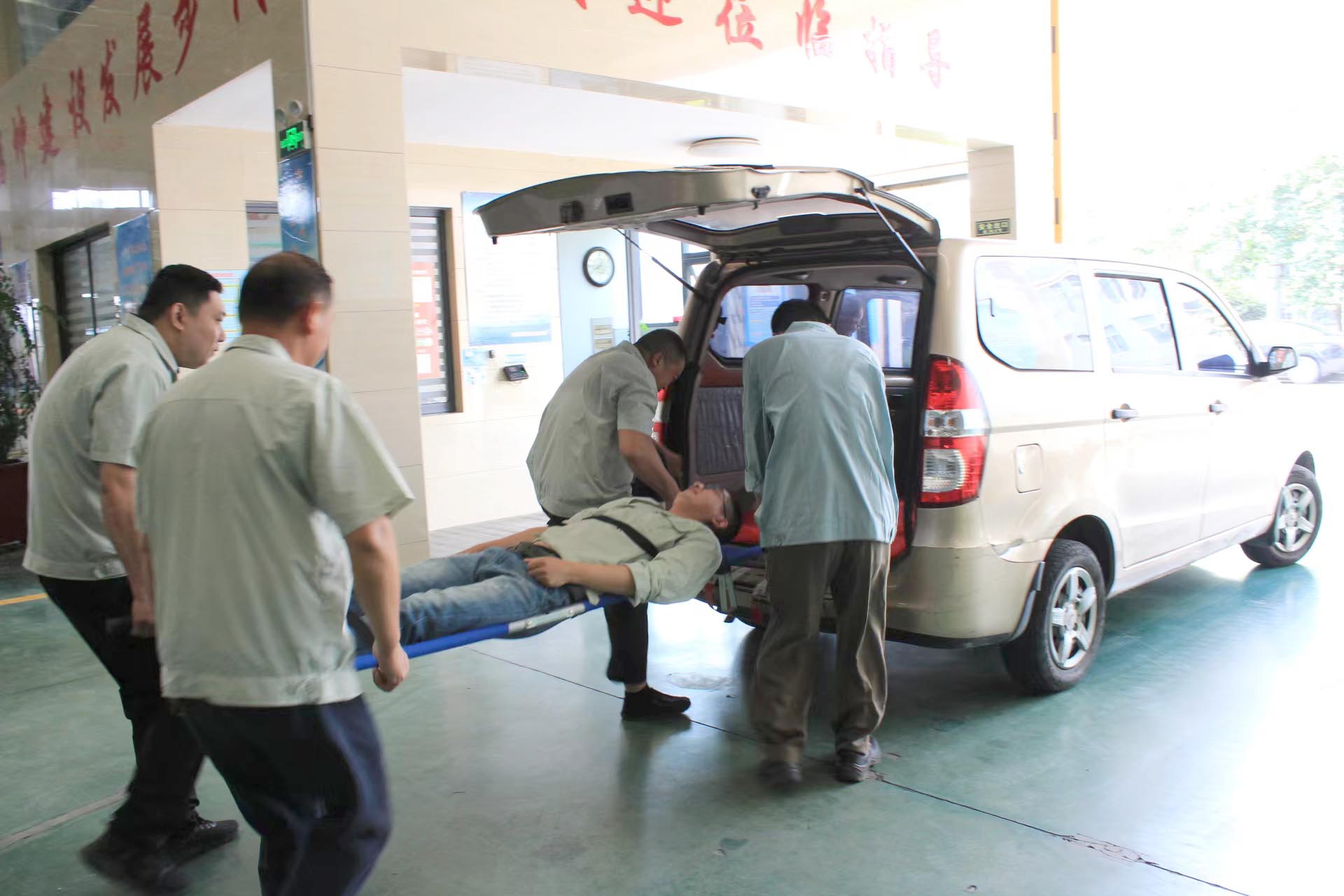 按照演練習預案,模擬夾膠班組一名員工突然中暑暈倒在地,班組員工發現情況后逐級上報,迅速將人員抬至陰涼處展開急救處理,敞開上衣,領取急救物品及擔架,用冷濕毛巾、冰袋等進行降溫,隨后將人員固定在擔架上,快速搬上急救車輛。